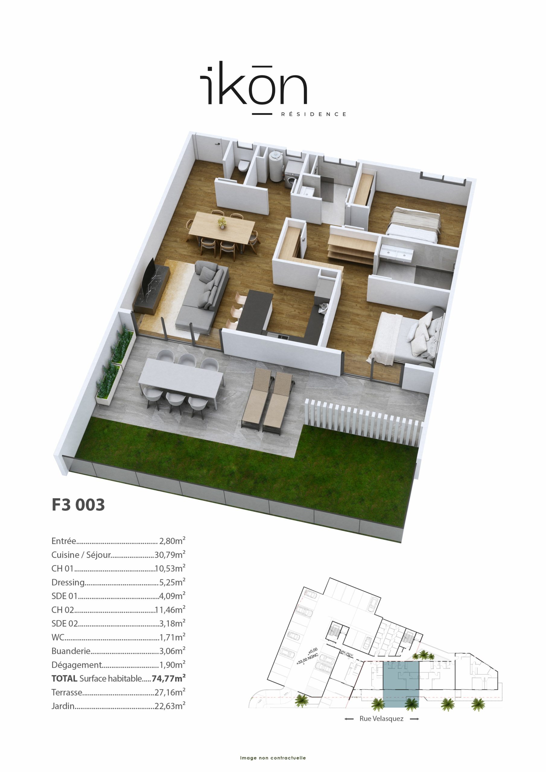 Une entrée, un séjour/cuisine équipée, une suite parentale climatisée avec SDE + WC, une chambre climatisée avec placard, une salle d’eau, un WC, une buanderie et une généreuse terrasse de près de 30m2 et un jardin de 22.63m2.