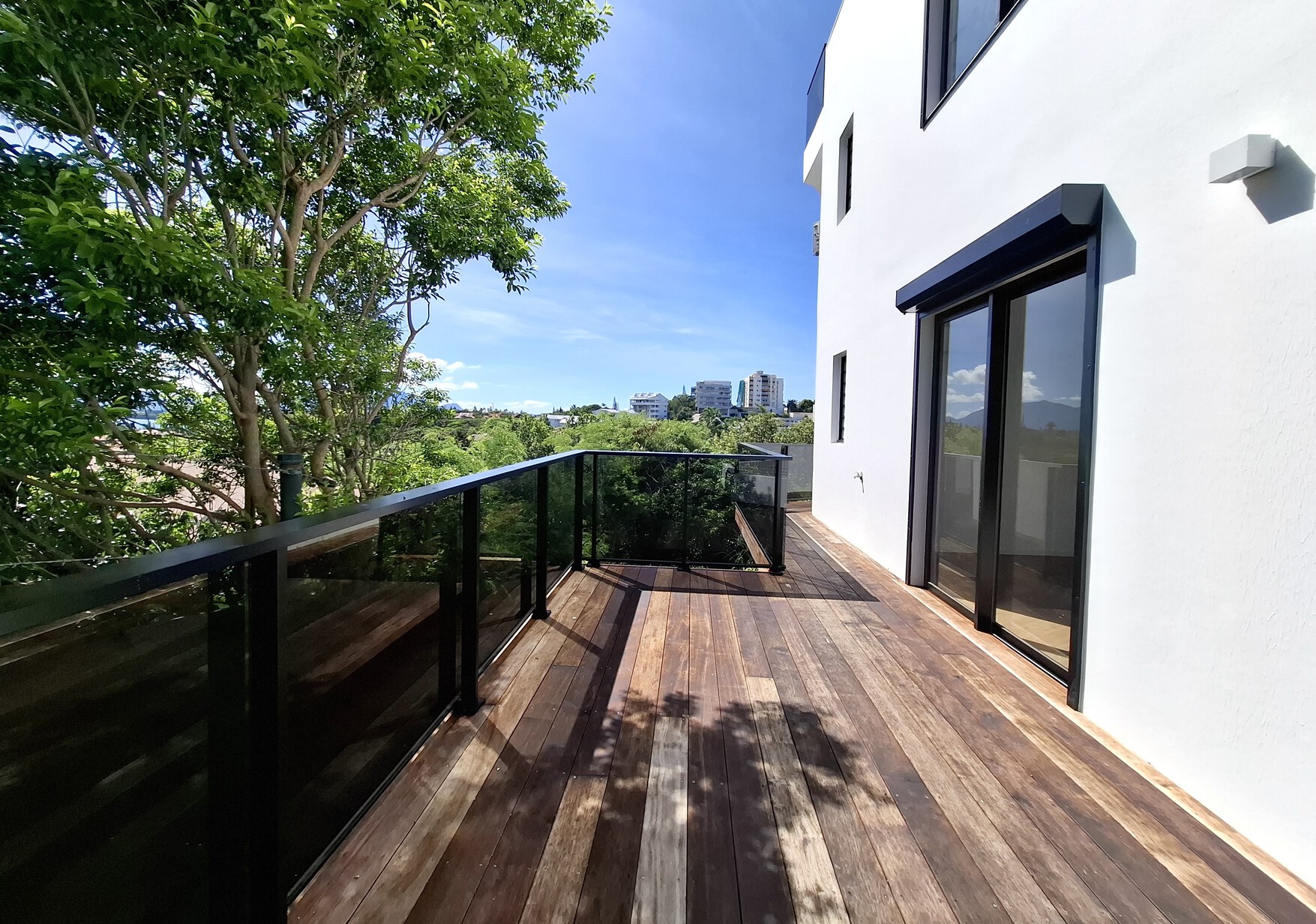 Une entrée, un séjour/cuisine équipée, une suite parentale climatisée avec SDE + WC, deux chambres climatisées avec placards, une salle d’eau, un WC, une buanderie et une généreuse terrasse de près de 44m2, un beau jardin et un deck.