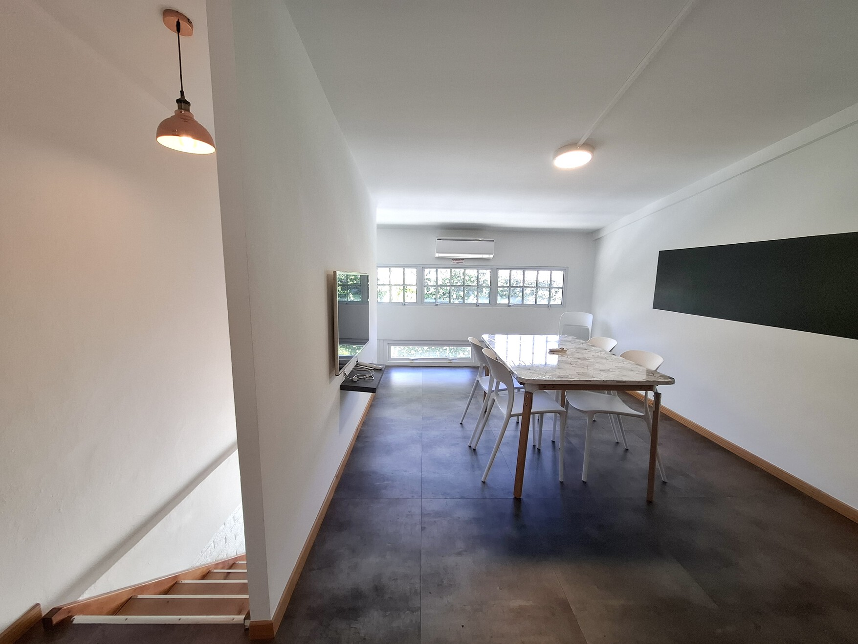 À l’étage : une pièce principale climatisée de type “salle de réunion”, une cuisine récente équipée et une salle d’eau à l’italienne.